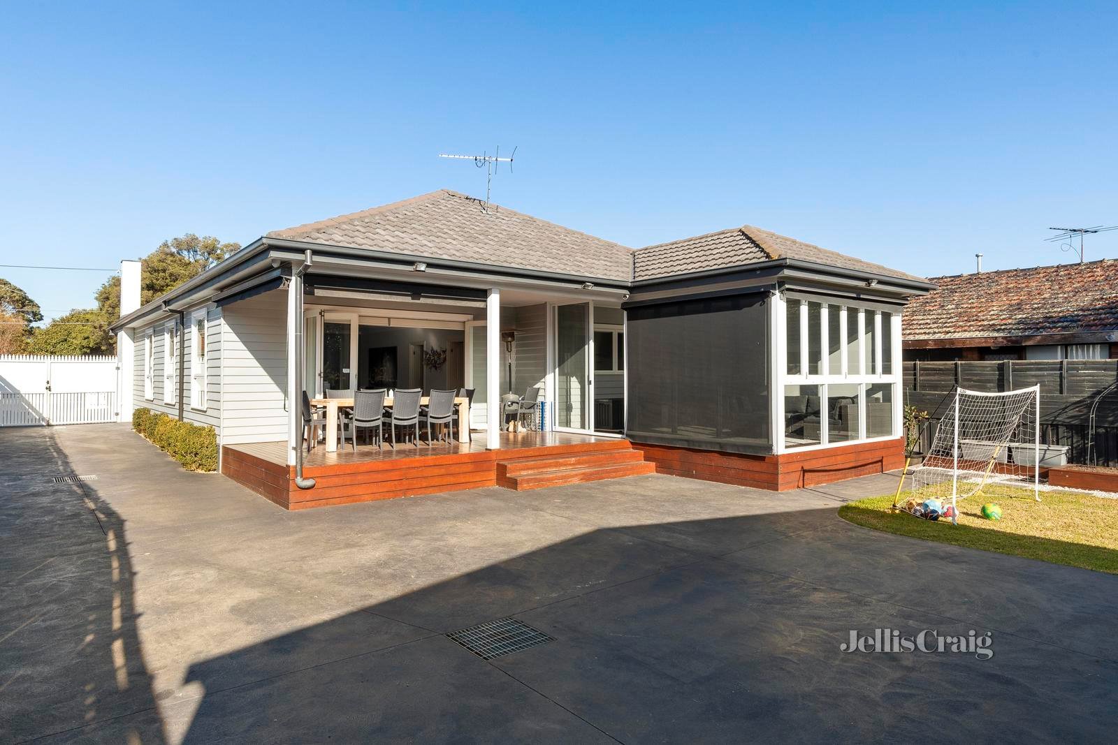 Behind a classic white picket fence, on a quiet street, this fully renovated three bedroom weatherboard home offers style and a sense of freedom: to move, grow or just be. The open plan living and dining zone is generously proportioned, with natural light enhanced by a tasteful, understated palette. Throughout, high ceilings soar above dark timber flooring, while an inclusive layout encourages