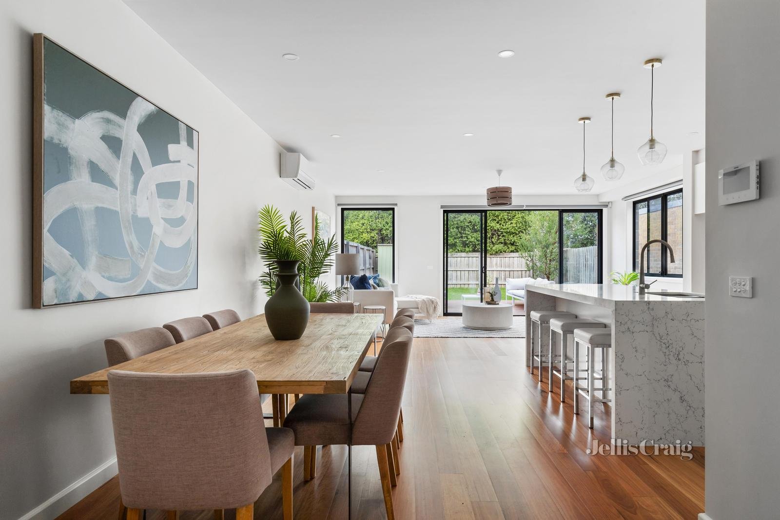 Stretching out on a superbly deep block, this super stylish four bedroom three bathroom town residence gives you that extra edge of family space. Setting the tone with its impressive entrance that showcases textured wallpaper and introduces the beautiful timber floors, this gorgeous home provides double doors to a flexible downstairs bedroom, a chic bathroom and a vogue open plan living and dining